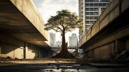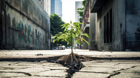 A vibrant green tree rises dramatically from cracked asphalt in an urban setting, showcasing nature's resilience amidst concrete surroundings. This image symbolizes hope and renewal in a bustling city life.