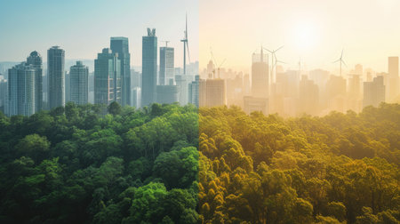 A futuristic cityscape blends with lush greenery, symbolizing sustainable urban living. AIG41