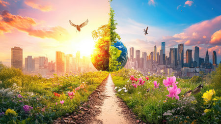 This captivating image depicts a split landscape of nature and urban life, showcasing a vibrant sunrise, blooming flowers, and a serene path, representing harmony.