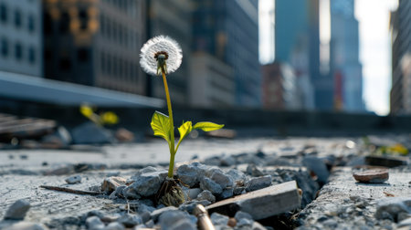 A striking dandelion stands tall amidst cracked concrete in an urban setting, symbolizing nature's resilience and persistent beauty in challenging environments.