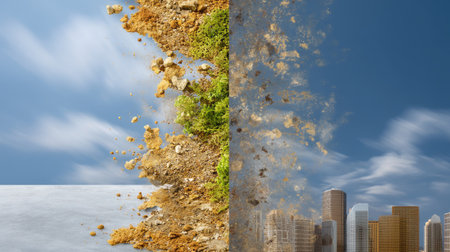 Stunning conceptual artwork illustrating the transition from lush nature to a chaotic urban landscape, showcasing the impacts of development on the environment.