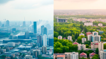 Contrasting views show a smoggy cityscape with heavy pollution on one side and a clear, vibrant skyline on the other side, emphasizing air quality differences.