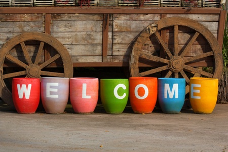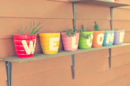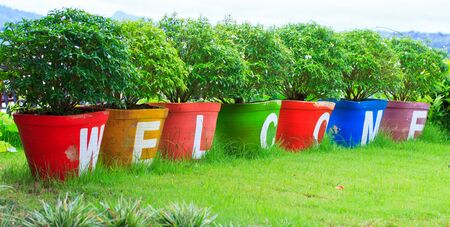 Welcome word on flowerpot with plants in the yard. Eco friendly, welcome home concept