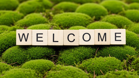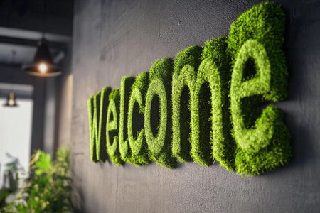 Letters crafted from vibrant green moss form a welcoming display on the wall, adding a touch of nature to the urban environment. The setting is airy, inviting, and full of life.