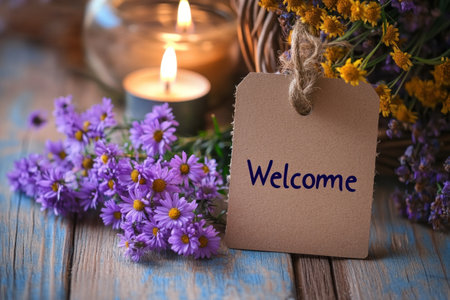 A photo of the text Welcome written on an empty tag, next to purple flowers and daisies, with a wood background and a candle. --ar 3:2 --v 6.1 Job ID: ff983905-e603-4942-9f76-2523c4d2834c