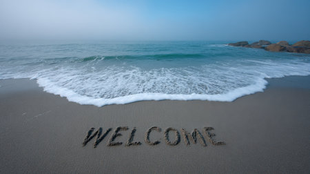 A serene beach scene featuring a welcome message elegantly written in the sand, with gentle waves lapping the shore under a foggy sky.