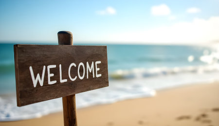 A warm welcome message crafted from sand sits on a serene beach, with gentle waves lapping at the shore under a clear blue sky. Perfect for summer vibes.