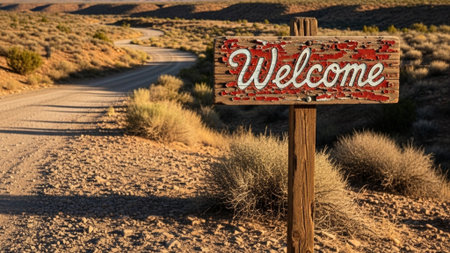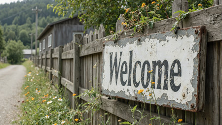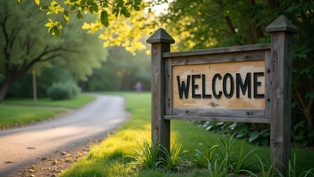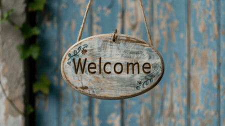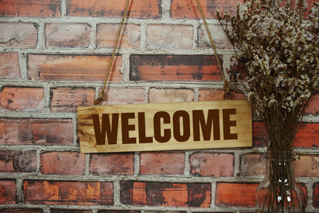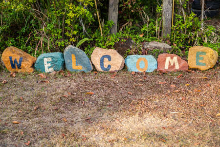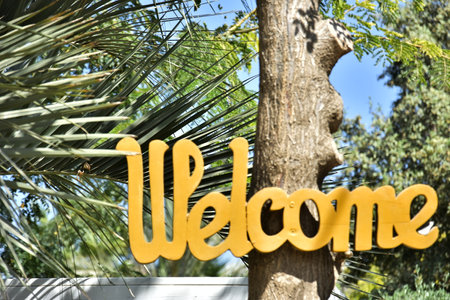 A sign displaying the word “Welcome,†intended to greet or invite.
