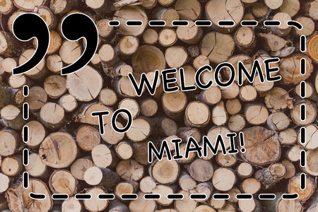 Text sign showing Welcome To Miami. Business photo showcasing Arriving to Florida sunny city summer beach vacation Wooden background vintage wood wild message ideas intentions thoughts