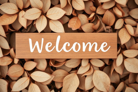 Welcome lettering on wooden signboard with autumn leaves background, vintage toned