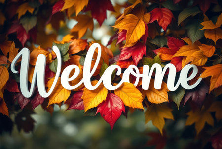 A close-up photograph showcasing a dense arrangement of colorful autumn leaves with 'Welcome' text overlayed