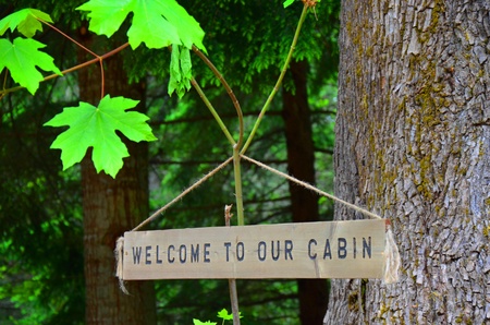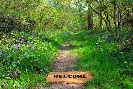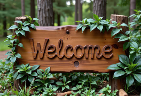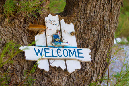 Welcome sign on a cardboard between the leaves. Selective focus points. Blurred background