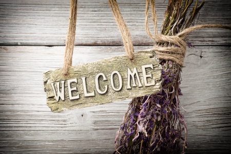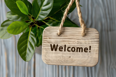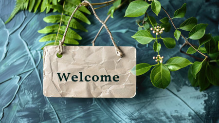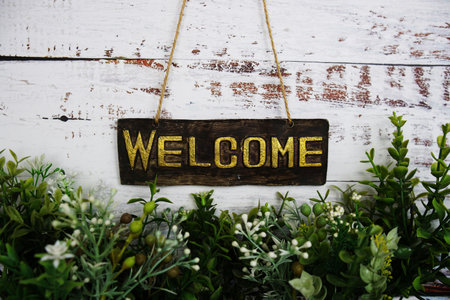 Welcome sign hanging with rope and green artificial plant on wooden background