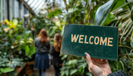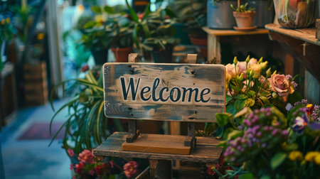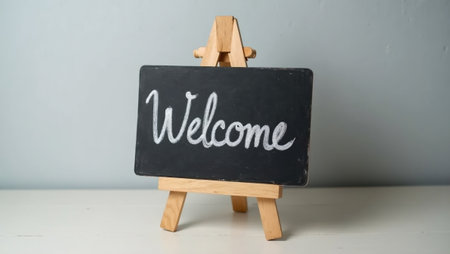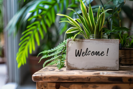 Welcome Sign on Table with Plants, Symbolizing a Warm Onboarding Process in the Workplace