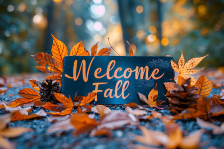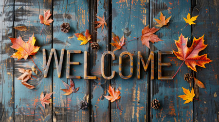 A welcome sign made of wooden letters with a rustic finish, adorned with fallen autumn leaves and pine cones on a weathered blue wooden background.