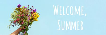 Welcome summer text. Female hand holds bright colorful bouquet of wild flowers against blue sky. Hello summer concept.