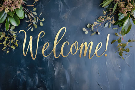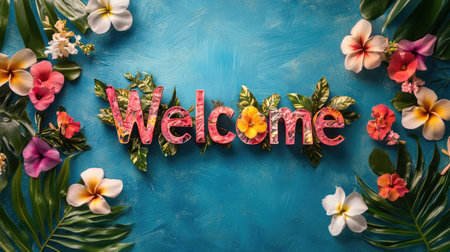 Welcome word in floral style on blue background. Greeting text for events, weddings, promotion and hospitality industry.