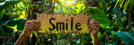 A hand-painted sign with the word Smile is held by a person in a lush park, promoting a simple yet powerful message of positivity connection with nature, banner