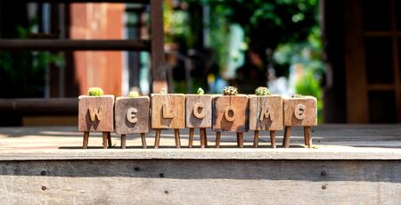 Welcome word made from vintage letterpress type blocks on a wooden table