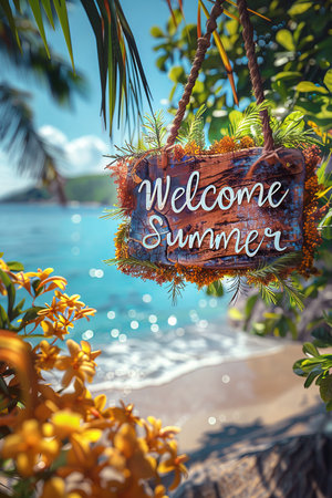 Scenic tropical beach landscape, wooden sign with Welcome Summer inscription. Bright illustration of summer theme.