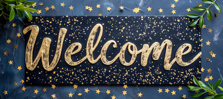 A sparkling welcome display made of golden letters on a reflective surface. The shimmering background enhances the cheerful ambiance, perfect for celebrations and gatherings..