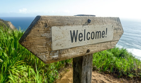Wooden signpost with welcome message on a cliff overlooking the ocean