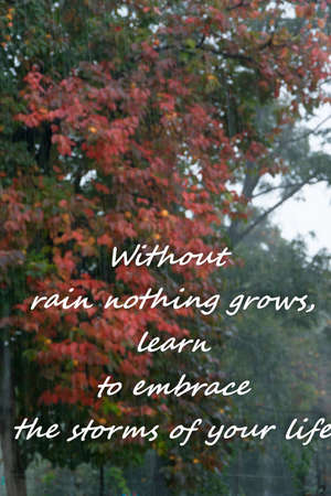 Rainy weather background with text - Without rain nothing grows, learn to embrace the storms of your life, motivational concept