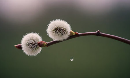 Pussy-willow branch with buds and drops of water.