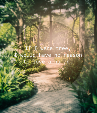 Meaningful quote on blurred garden background, if i were tree, i would have no reason to love a human.