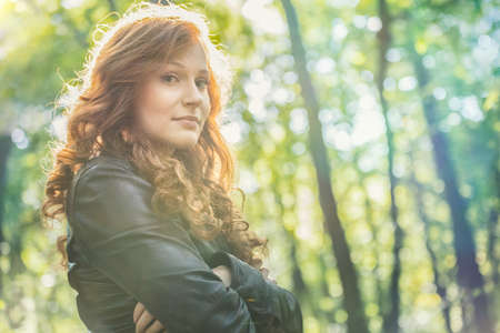 Beautiful girl posing with crossed arms in the woods