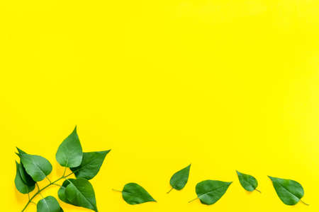 set of green leaves, yellow background.space for text. Top view