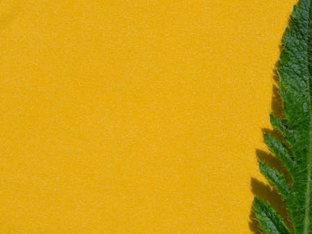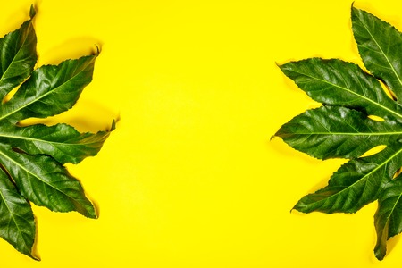Yellow background with a textured natural green leaf as a frame. Flat lay, top view