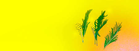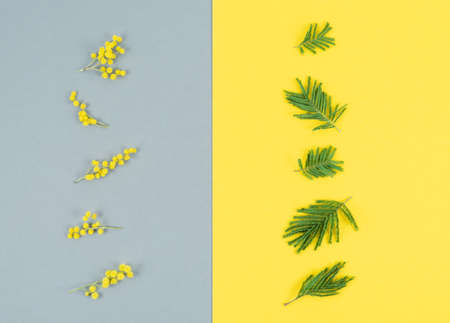 Mimosa flowers and leaves on gray and yellow background vertically. Color of the year. Copy space.