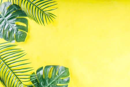 Tropical background. Palm and monstera leaves on yellow blue background. Flatlay, top view, minimal layout, summer concept