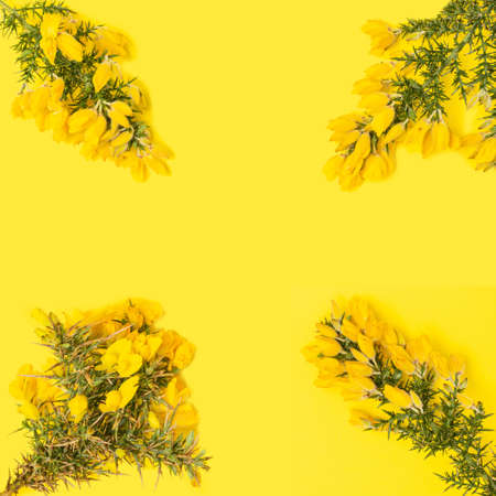 Four gorse hedging branches with flat lay arrangement on splendid yellow background. Copy space.