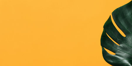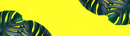Banner made from tropical jungle monstera leaves isolated on bright yellow background. Flat lay style.