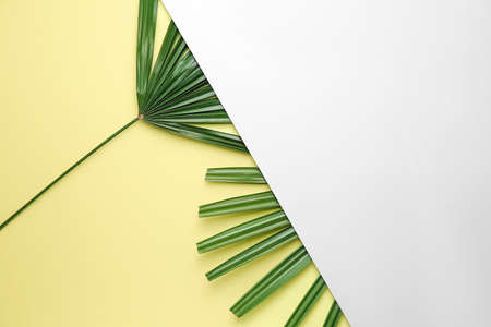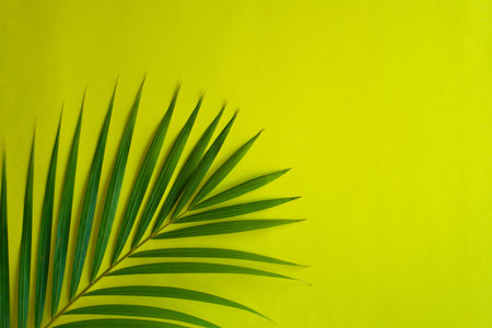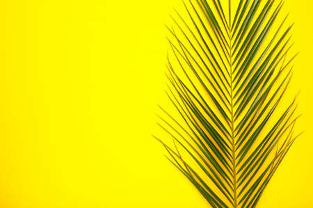 Still life colour photo palm leaf on yellow background top view flat layout