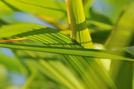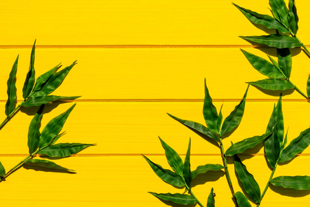 Tropical green grasses on yellow wood background top view shot.