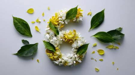 This beautiful floral design features white and yellow petals creatively arranged to form the number six, enhanced by vibrant green leaves. Ideal for celebrations!