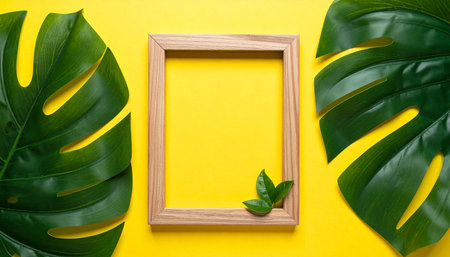 Tropical leaves and wooden frame on yellow background. Flat lay, top view.
