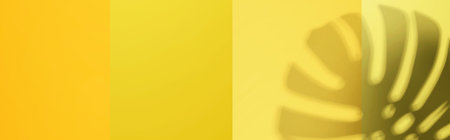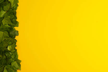 Colored background with a tropical jungle plant. Yellow background with green ivy in the sunlight. Copy space