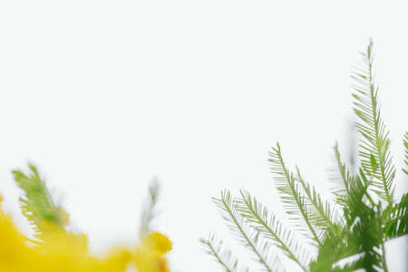 Blooming mimosa plant yellow flowers and green leaves close up macro on white isolated background. Spring background website banner with copy space for international womens day 8 march