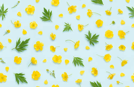 Seamless floral pattern of yellow blooming buttercup, common wild meadow flower, with buds, leaves and petals top view flat lay background.