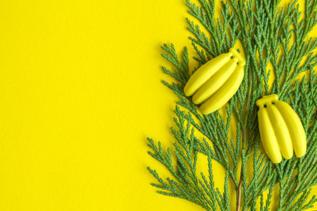 Green leaves on a branch with a yellow background, with copy space