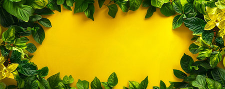 Green leaves create a lush border framing a vibrant yellow area in the middle. Ideal for refreshing design themes and text overlays.