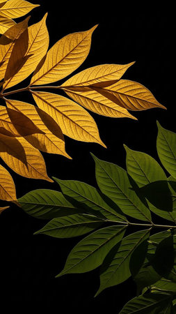 A striking visual contrast between golden yellow and deep green leaves, presented in a split composition against a pure black background, highlighting natural textures.