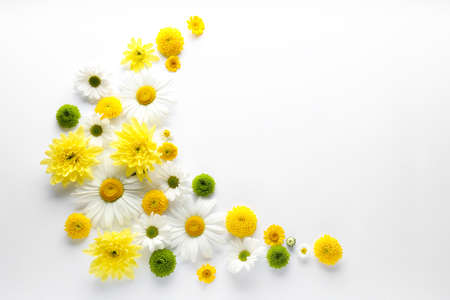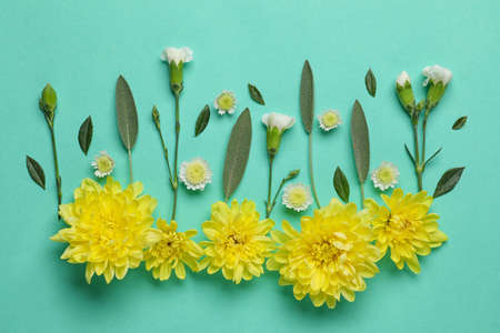 Beautiful yellow and white flowers composition on blue