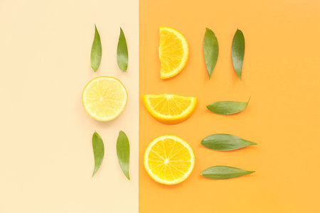 Orange and lemon slices with leaves on color background