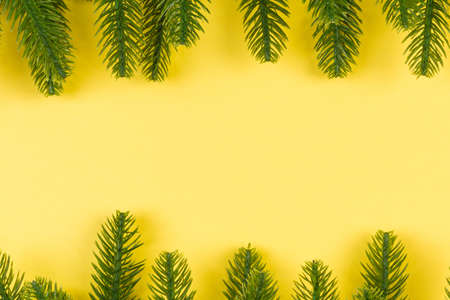 Top view of colorful festive background made of fir tree branch. Christmas holiday concept with copy space.
