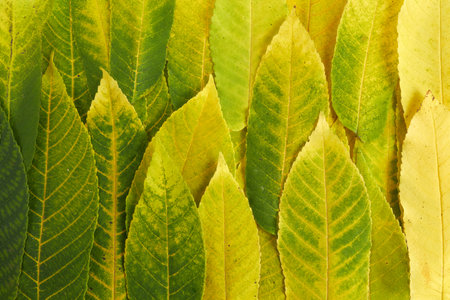 Top View Autumn season background with bright leaves colored from green to yellow. Gradient colors of the fall foliage.